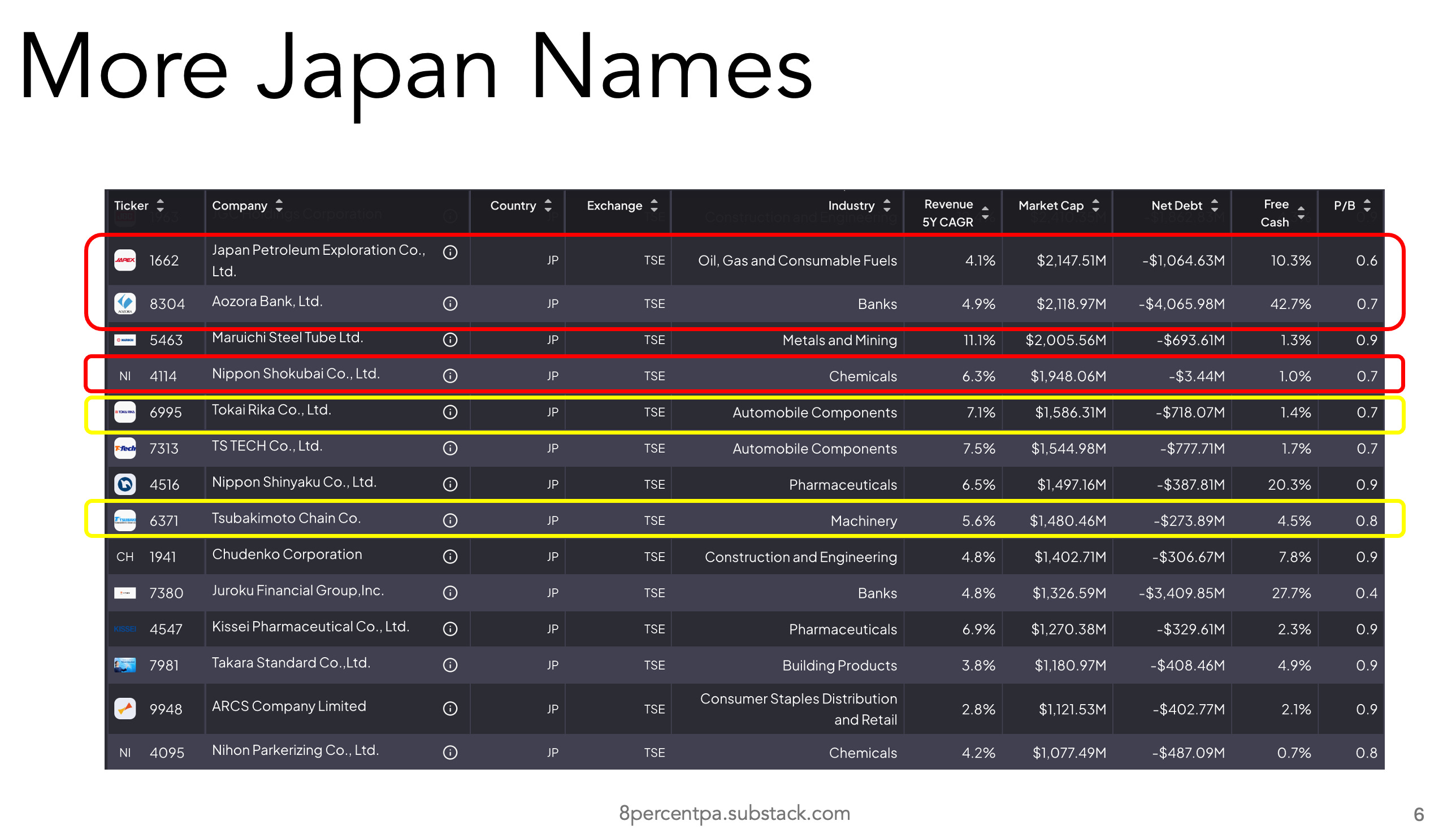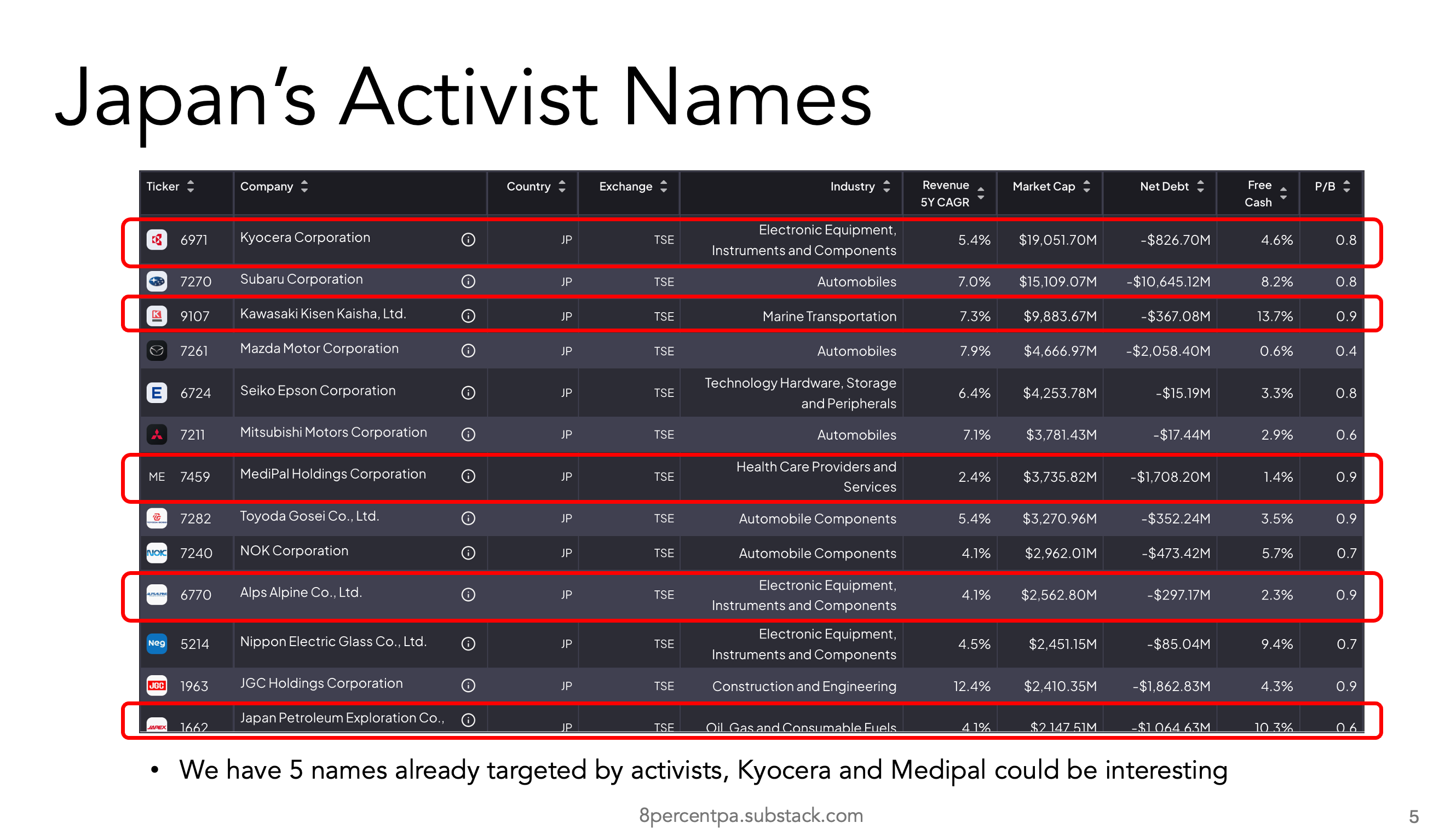 At the bottom, we highlighted two names in yellow which are interesting take-private plays. Toyota could take Tokai Rika private if engaged by activists.