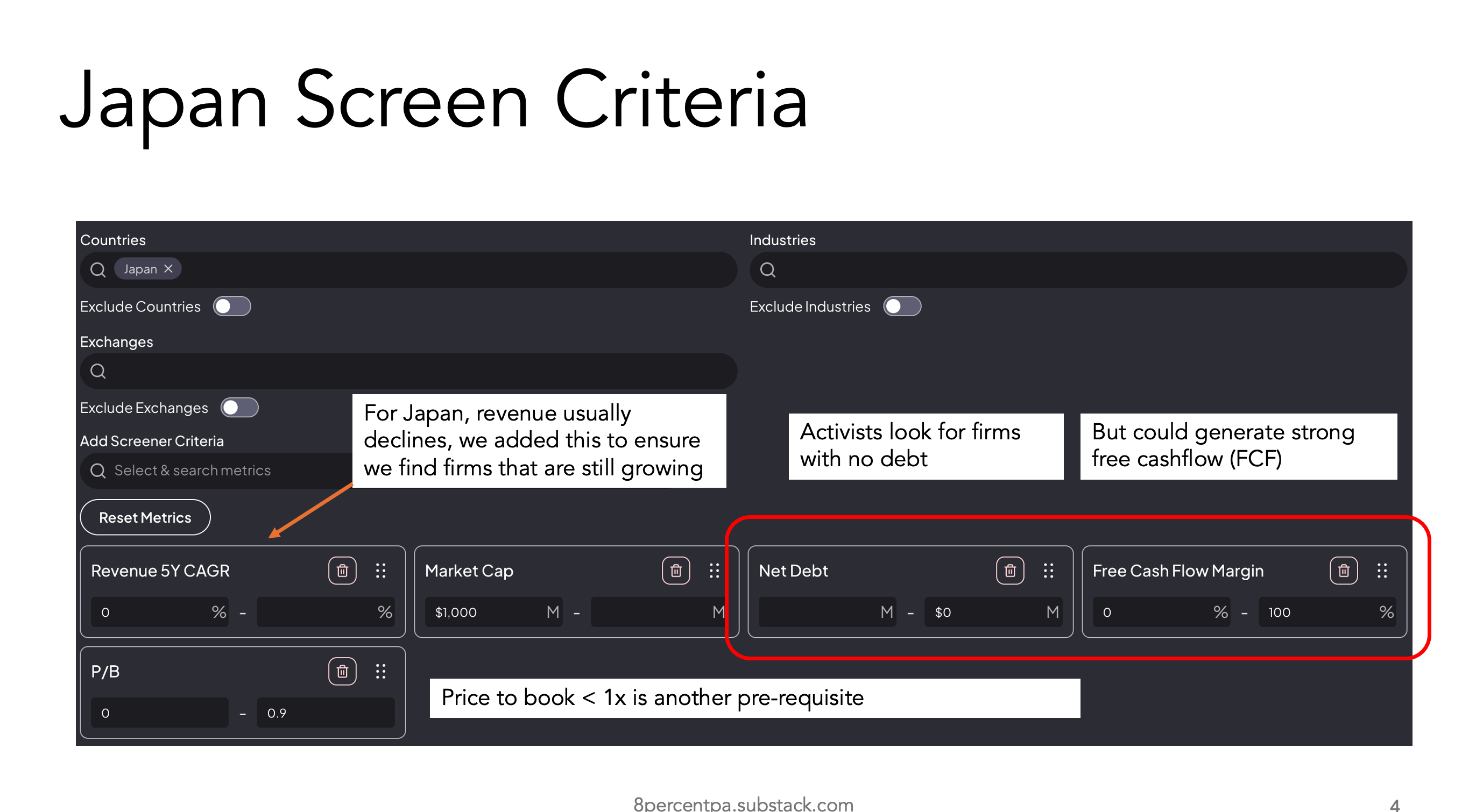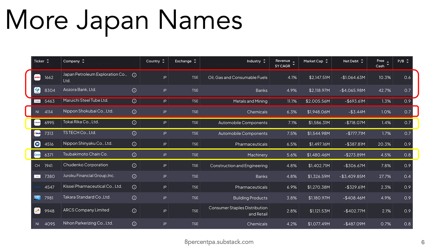 We conducted the first screen for Japan. We screened for revenue growth (>0%), no debt i.e. net cash co.s and positive free cashflow (FCF) margins.