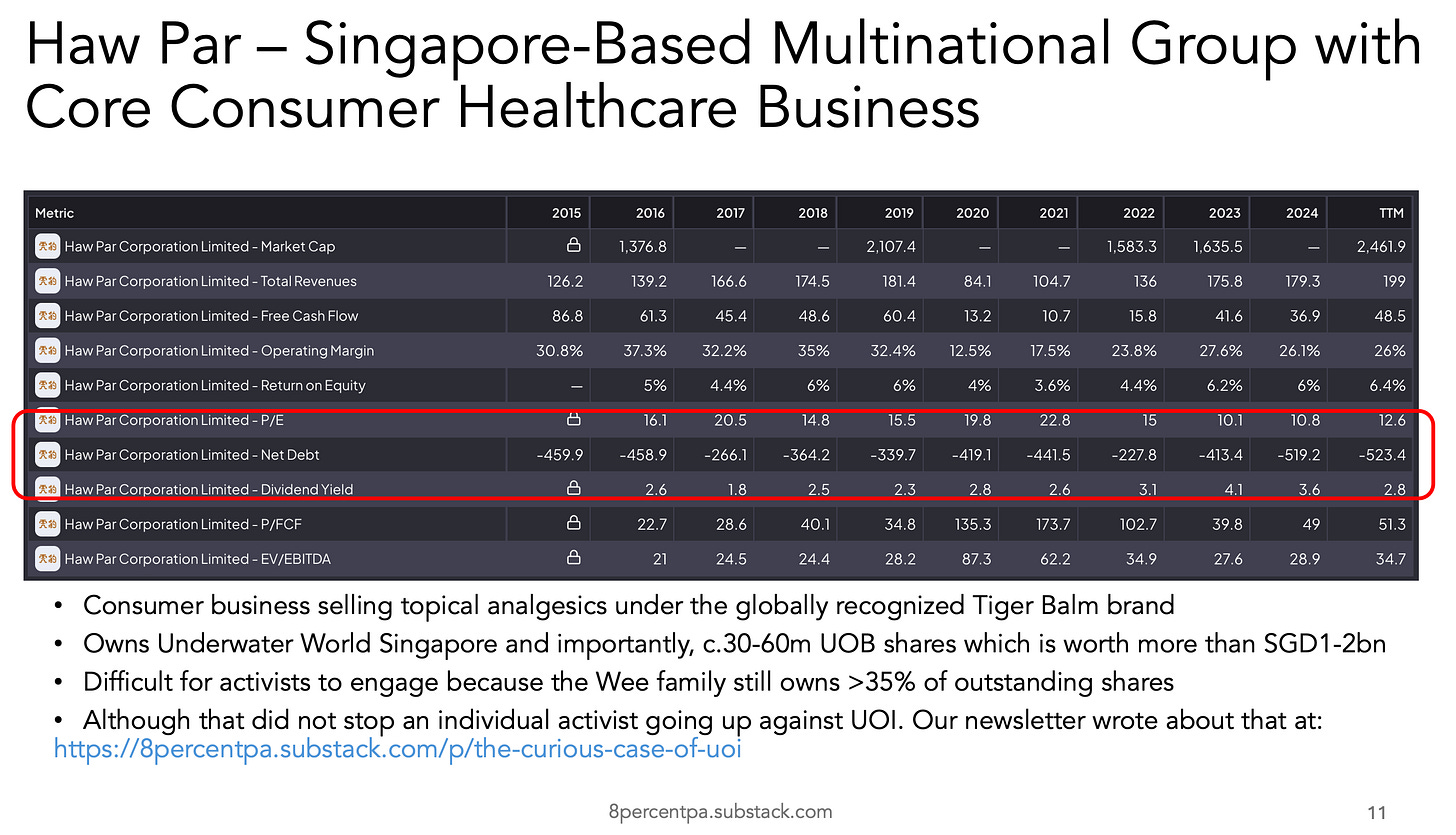 Haw Par is a unique Singapore stock primed for activist action. It is cheap, has lots of cash and pays dividend as shown in the red box.